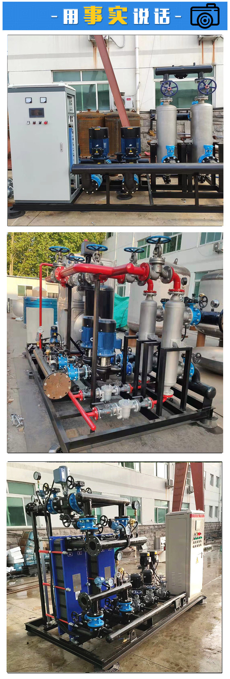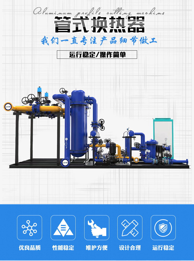 管殼式換熱機組由金能達管殼式換熱器、智能溫控裝置、智能電控裝置、循環泵、補水泵、穩壓膨脹水箱、補(凝)水箱、過濾器、閥門、儀表、傳感器、配管底座等組成。
