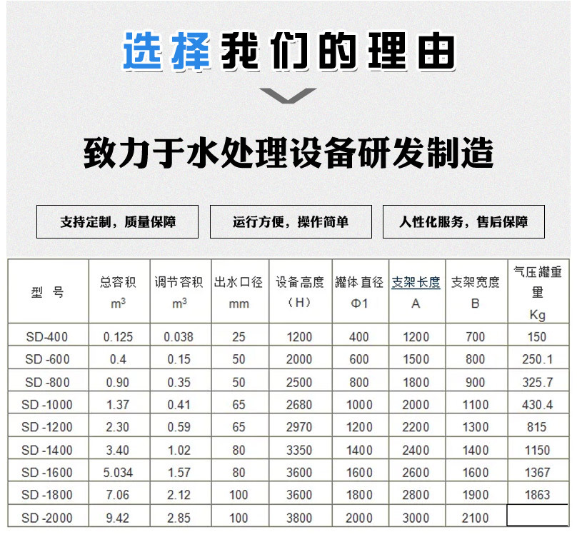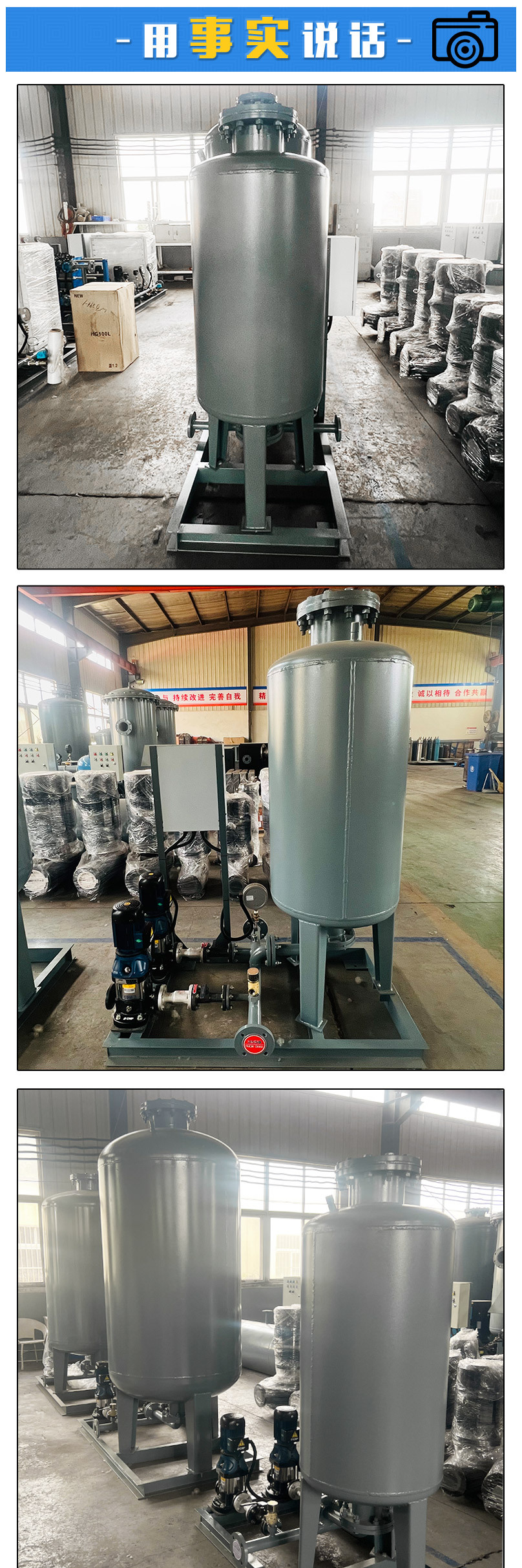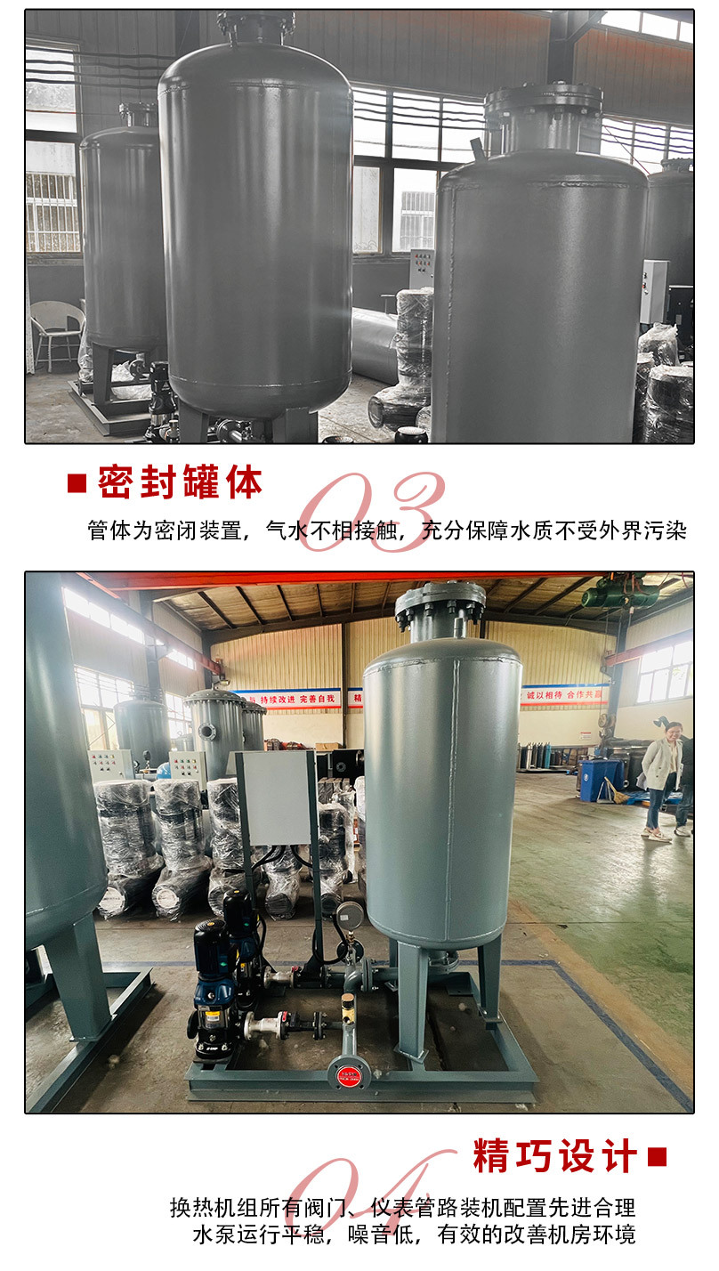 在閉環系統中,為了確保系統壓力的穩定性,需要調節的膨脹設施。當系統壓力降低時,與其連接的壓力罐的水室壓力也降低,空氣室的容積膨脹,壓力也降低。當控制系統設置下限時,水泵自動打開以補充系統,直到達到設置。設定壓力上限,泵停止運轉。當系統中的水被加熱時,溫度升高,體積膨脹,氣室被擠壓,壓力系統的壓力升高。達到極限值時,系統中的水通過安全釋放裝置進入膨脹機(或軟化水箱)。系統壓力也下降到設定值并停止壓力釋放。達到定壓補水的作用。
